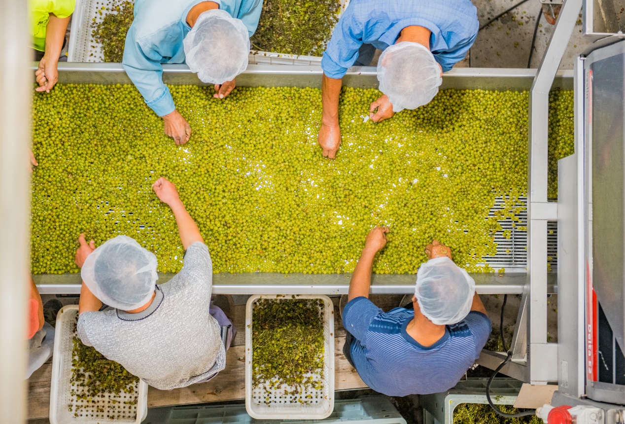 在12℃左右的溫度下將葡萄收入發(fā)酵車間后,我們對這些葡萄進行了第一次分選,以去除MOG(主要是葉子,蟲子,小石頭),和不是很好的葡萄果實。我們通常雇用大約6-8人來進行第一次分揀,如果有必要的話,我們會雇傭更多的人。因為對我們來說,用最好的葡萄來釀造高品質(zhì)的葡萄酒對我們來說更加重要。因為今年葡萄果實非常好,所以6人足夠。